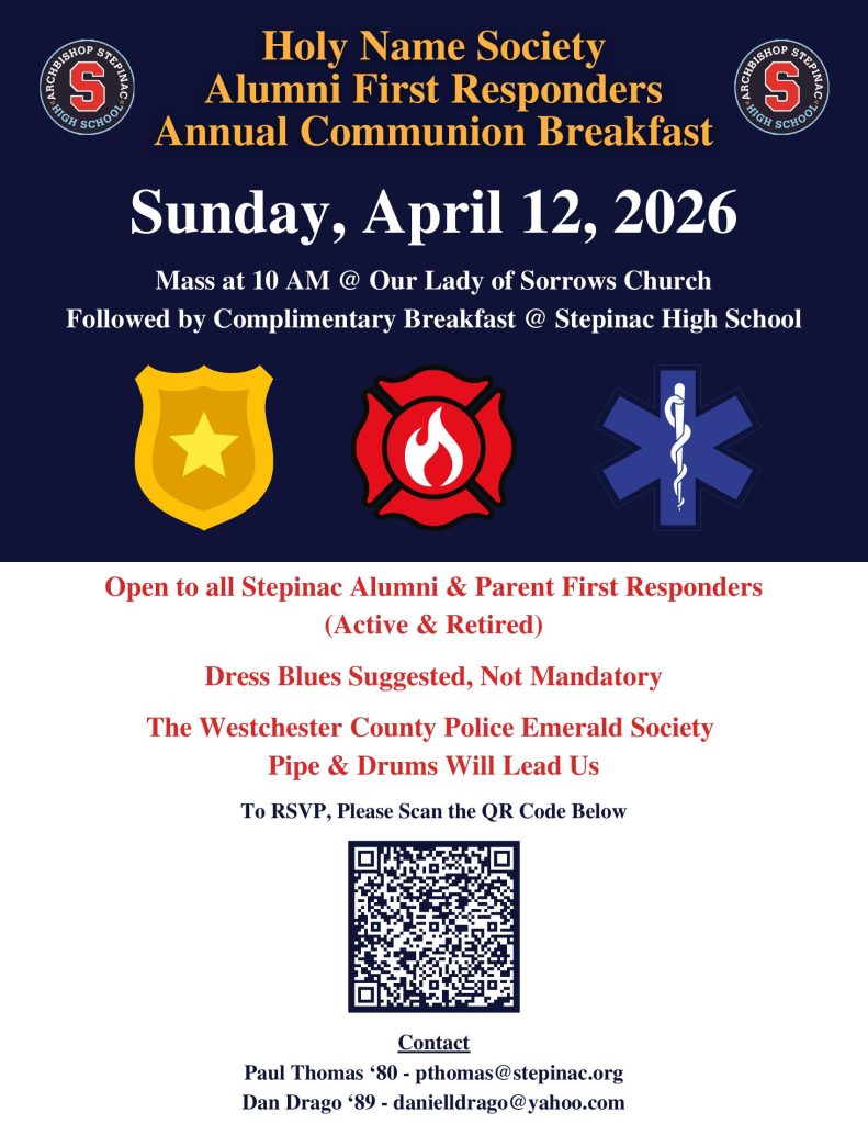 The Holy Name Society will host a special gathering on Sunday, April 12, 2026. The morning begins with Mass at 10:00 AM at Our Lady of Sorrows Church, followed by a complimentary breakfast at Stepinac High School.