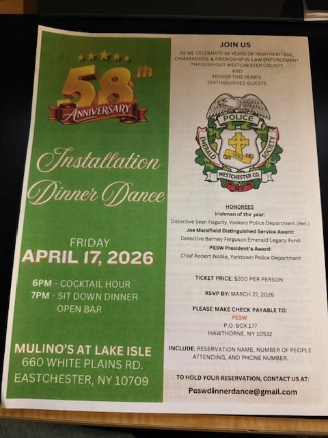Join us as we celebrate 58 Years of Irish Heritage, Camaraderie & Service in Law Enforcement at the 58th Anniversary Installation Dinner Dance of the Police Emerald Society of Westchester